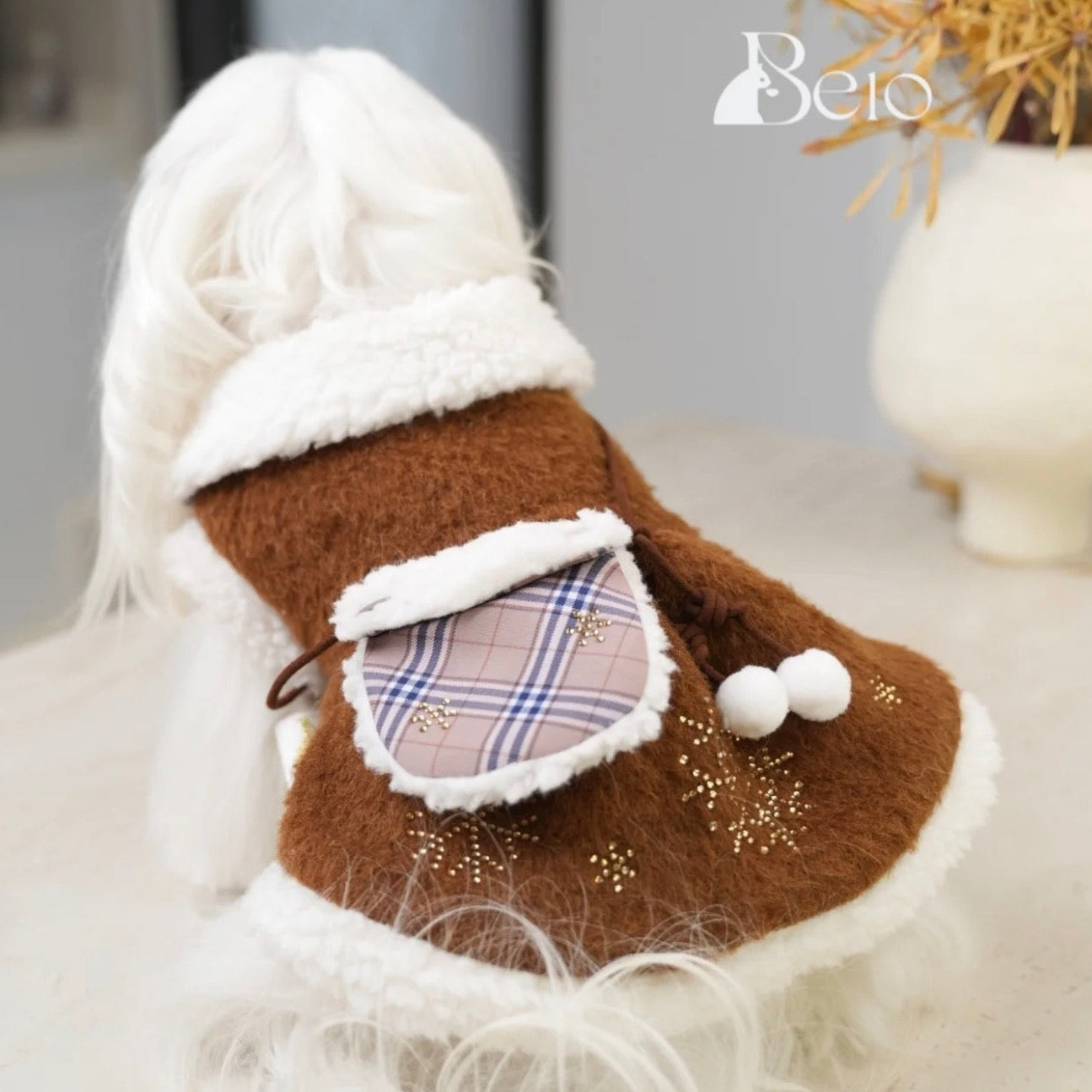 This refined pet outfit features a rich deep brown tone with delicate snowflake rhinestone embellishments, creating a timeless and luxurious look. Designed as a coat and dress set, it brings a graceful, vintage aesthetic perfect for stylish pets.
